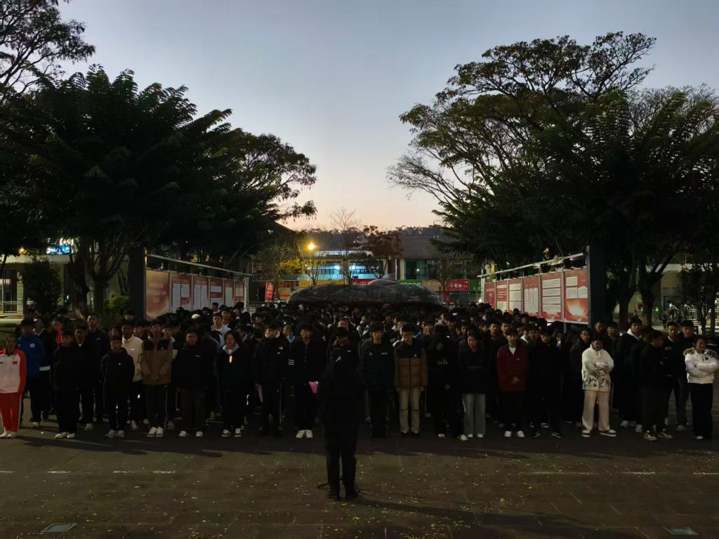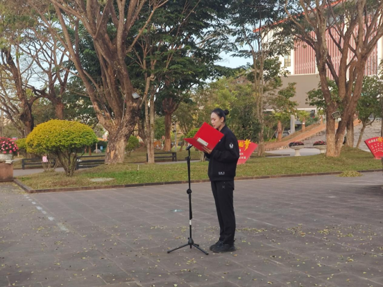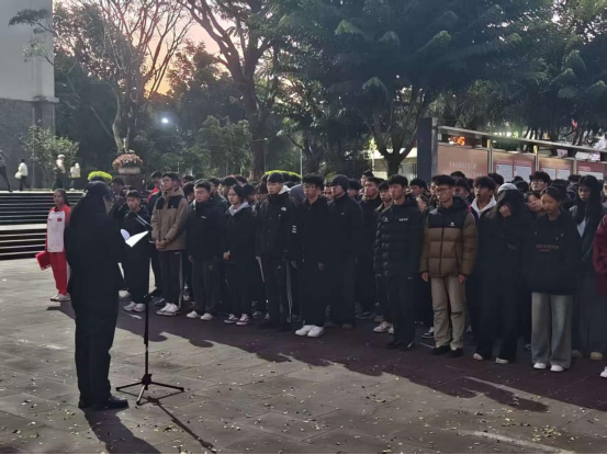 为深入学习贯彻党的二十届四中全会精神,将爱国情怀、拼搏精神与体育使命深度融合,激励全体师生以昂扬姿态投身体育强国建设,12 月 8 日上午 7 时,体育学院在学校团结广场举行“聚焦全会新篇,铸就体育华章”主题升旗仪式。学院全体师生参加活动,仪式由学院党总支副书记主持。